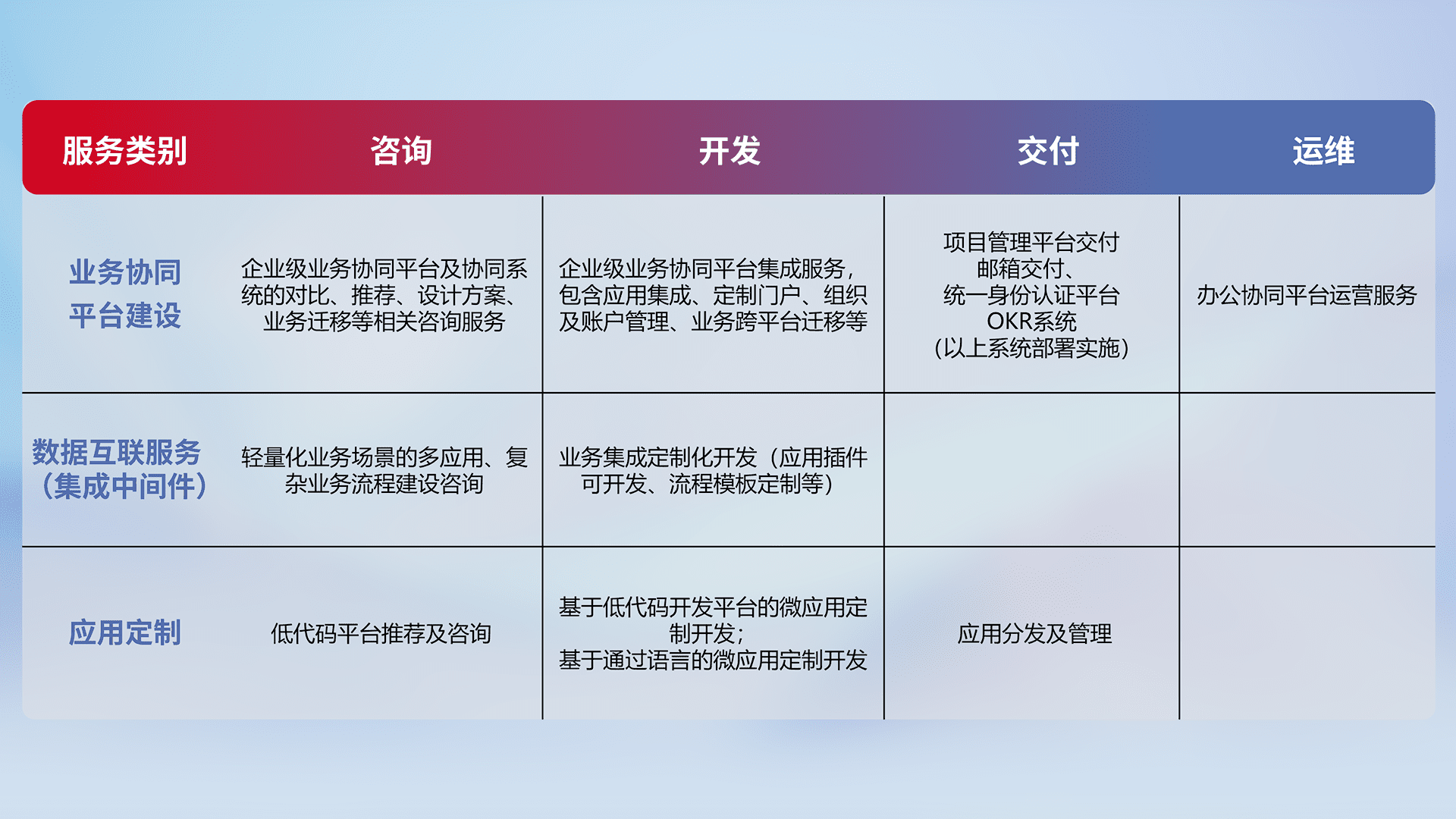 针对钉钉、、、、企微、、、、IDaas等平台级产品提供产品的规划、、方案、、交付、、、定制化开发等服务,,,实现如统一协同办公、、、、智能客户服务、、、混合会议管理、、、、智能数据查询、、、等业务场景,,实现数字化转型。。。。